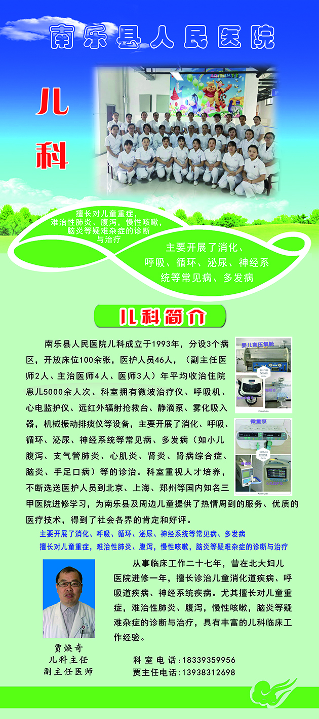 南乐县人民人民医院儿科成立于1993年,分设3个病区,开放床位100余张,医护人员46人(副主任医师2人、主治医师4人、医师3人),年平均收治住院患儿4000余人次、科室拥有微波治疗仪、呼吸机、心电监护仪、远红外辐射抢救台、静滴泵、雾化吸入器,机械振动排痰仪等设备,主要开展了消化、呼吸、循环、泌尿、神经系统等常见病、多发病(如小儿腹泻、支气管肺炎、心肌炎、肾炎、肾病综合症、脑炎、手足口病)等的诊治。
