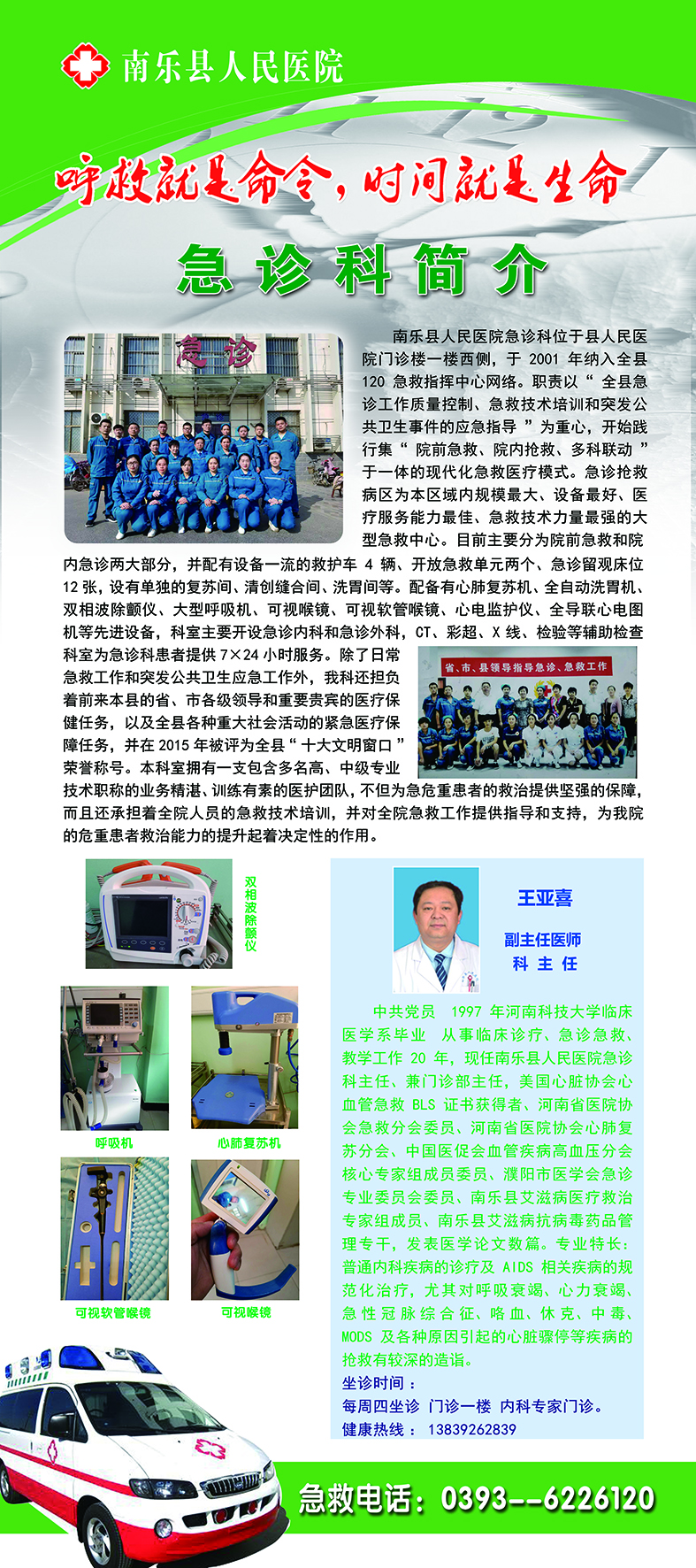 南乐县人民医院急诊科位于县人民医院门诊楼一楼西侧,于2001年纳入全县120急救指挥中心网络。职责以“全县急诊工作质量控制、急救技术培训和突发公共卫生事件的应急指导”为重心,开始践行集“院前急救、院内抢救、多科联动”于一体的现代化急救医疗模式。