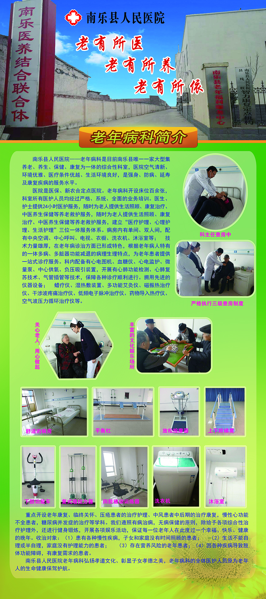 南乐县人民医院——老年病科是目前南乐县唯一一家大型集养老、养生、保健、康复为一体的综合性科室,医院空气清新、环境优雅、医疗条件优越、生活环境良好,是强身、防病、延寿及康复疾病的服务平台。 医院是医保、新农合定点医院。