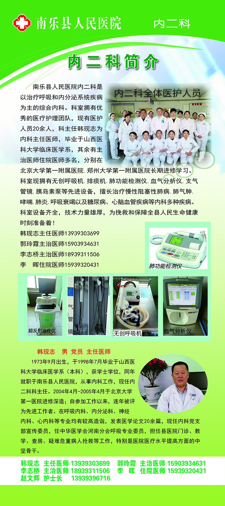 南乐县人民医院内二科是以治疗呼吸和内分泌系统疾病为主的综合内科。科室拥有优秀的医疗护理团队,现有医护人员20余人,科主任韩现志为内科主任医师,毕业于山西医科大学临床医学系,其余有主治医师住院医师多名,分别在北京大学第一附属医院.郑州大学第一附属医院长期进修学习。科室现拥有无创呼吸机.排痰机.肺功能检测仪.血气分析仪.支气管镜.胰岛素泵等先进设备,擅长治疗慢性阻塞性肺病.肺气肿.哮喘.肺炎.呼吸衰竭以及糖尿病、心脑血管疾病等内科多种疾病。科室设备齐全,技术力量雄厚,为挽救和保障全县人民生命健康时刻准备着!