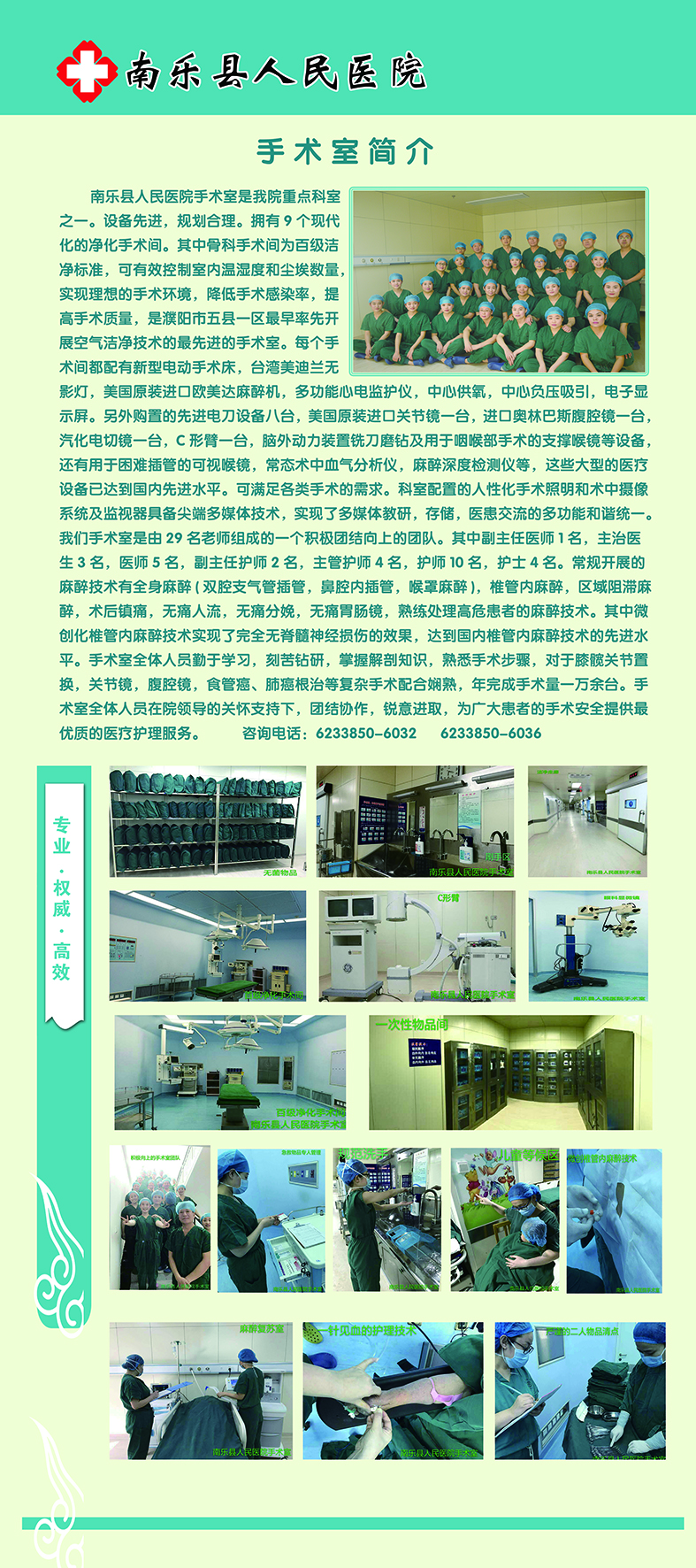 南乐县人民医院手术室是我院重点科室之一。设备先进,规划合理。拥有9个现代化的净化手术间。其中骨科手术间为百级洁净标准,可有效控制室内温湿度和尘埃数量,实现理想的手术环境,降低手术感染率,提高手术质量,是濮阳市五县一区最早率先开展空气洁净技术的最先进的手术室。每个手术间都配有新型电动手术床,台湾美迪兰无影灯,美国原装进口欧美达麻醉机,多功能心电监护仪,中心供氧,中心负压吸引,电子显示屏。另外购置的先进电刀设备八台,美国原装进口关节镜一台,进口奥林巴斯腹腔镜一台,汽化电切镜一台,C形臂一台,脑外动力装置铣刀磨钻及用于咽喉部手术的支撑喉镜等设备,还有用于困难插管的可视喉镜,常态术中血气分析仪,麻醉深度检测仪等,这些大型的医疗设备已达到国内先进水平。可满足各类手术的需求。科室配置的人性化手术照明和术中摄像系统及监视器具备尖端多媒体技术,实现了多媒体教研,存储,医患交流的多功能和谐统一。