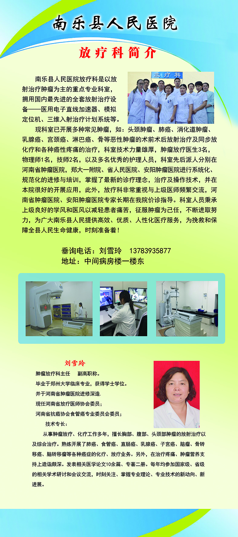 南乐县人民医院放疗科是以放射治疗肿瘤为主的重点专业科室,拥用国内最先进的全套放射治疗设备——医用电子直线加速器、模拟定位机、三维入射治疗计划系统等。 现科室已开展多种常见肿瘤,如:头颈肿瘤、肺癌、消化道肿瘤、乳腺癌、宫颈癌、淋巴癌、骨等恶性肿瘤的术前术后放射治疗及同步放化疗和各种癌性疼痛的治疗,科室技术力量雄厚。